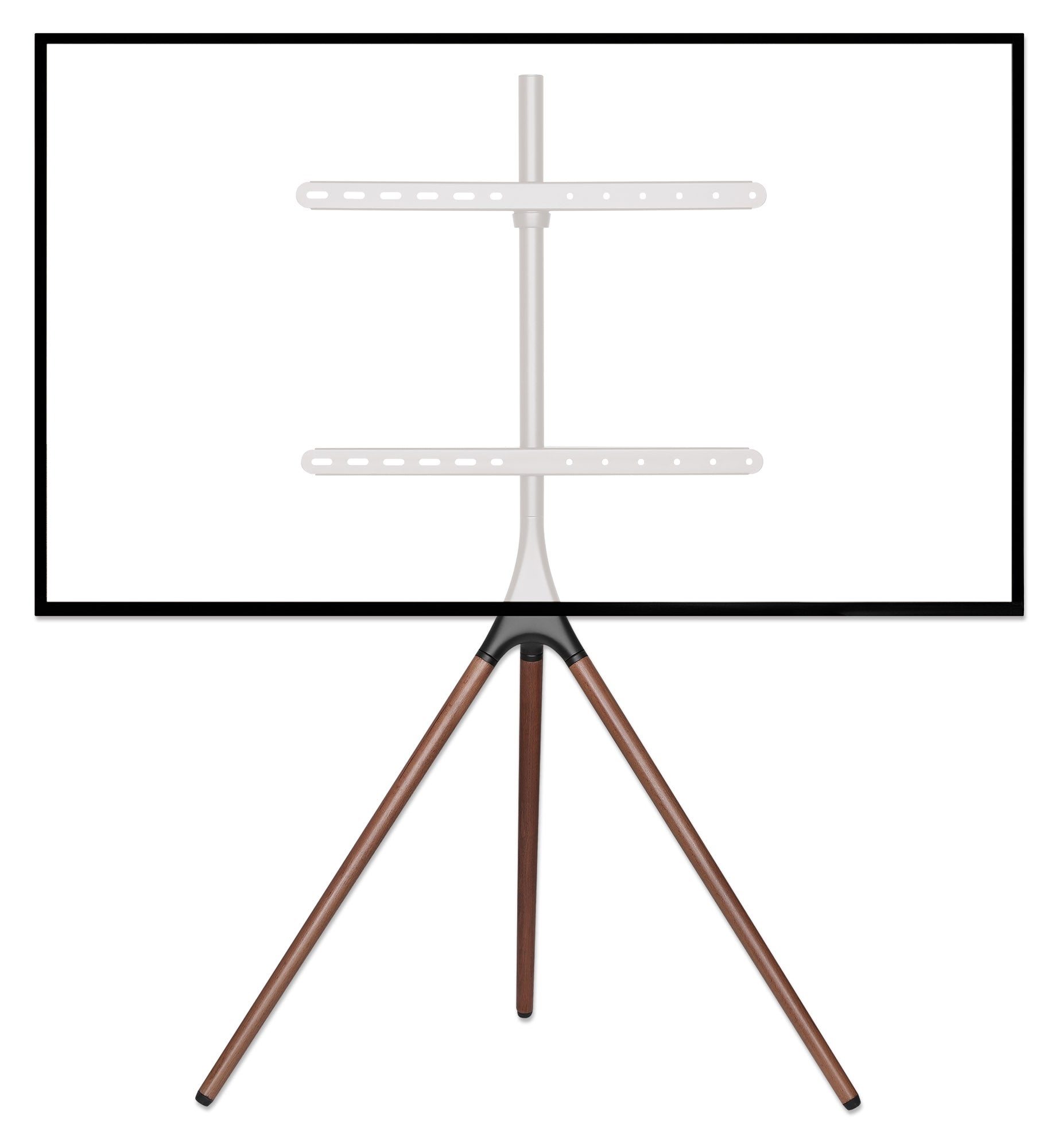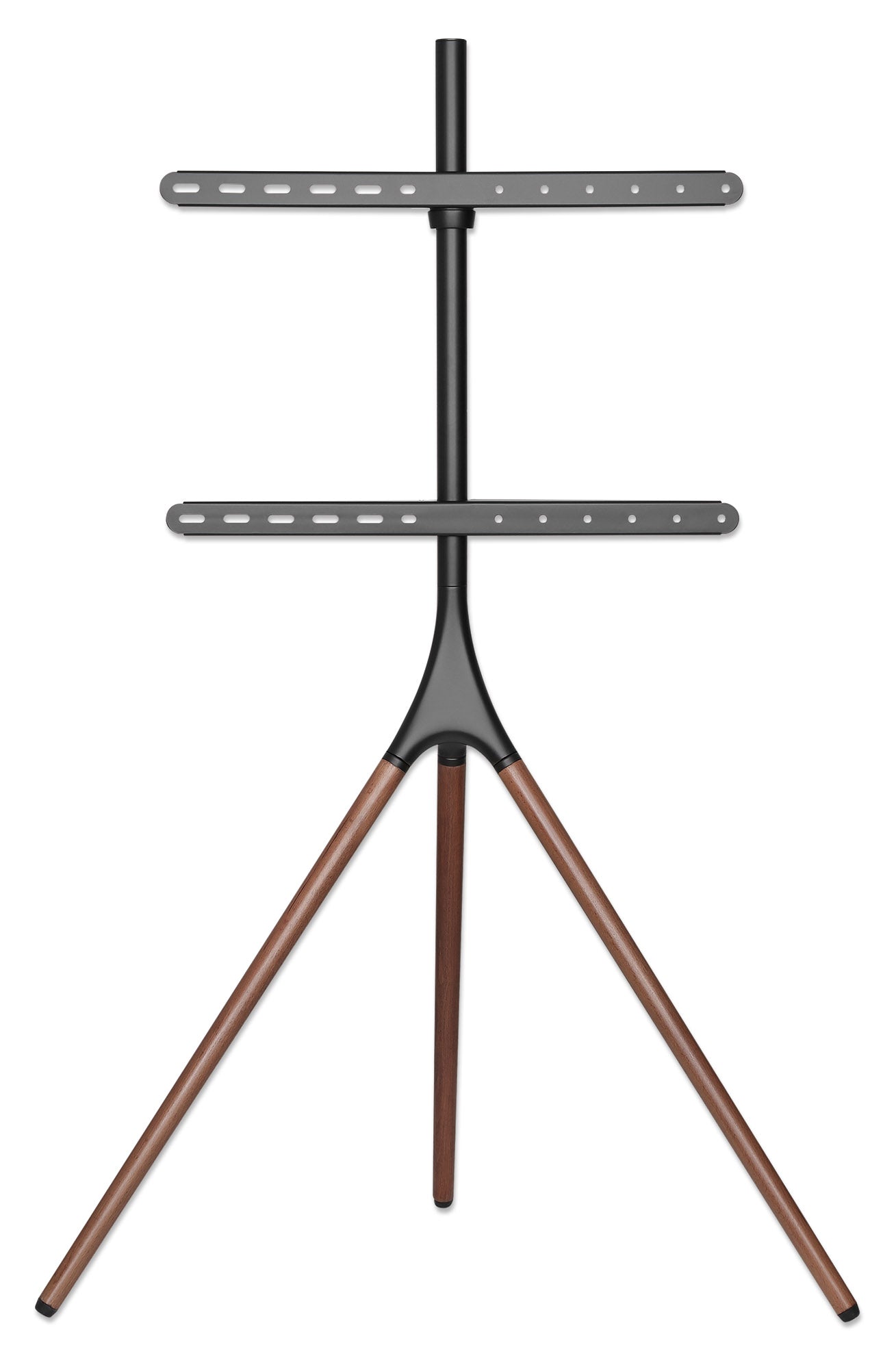 Supporta una TV da 45" a 65" fino a 32 kg, +/-180° di rotazione, altezza regolabile, costruito in alluminio-acciaio, gambe in legno di noce, piedini in gomma, nero/marrone