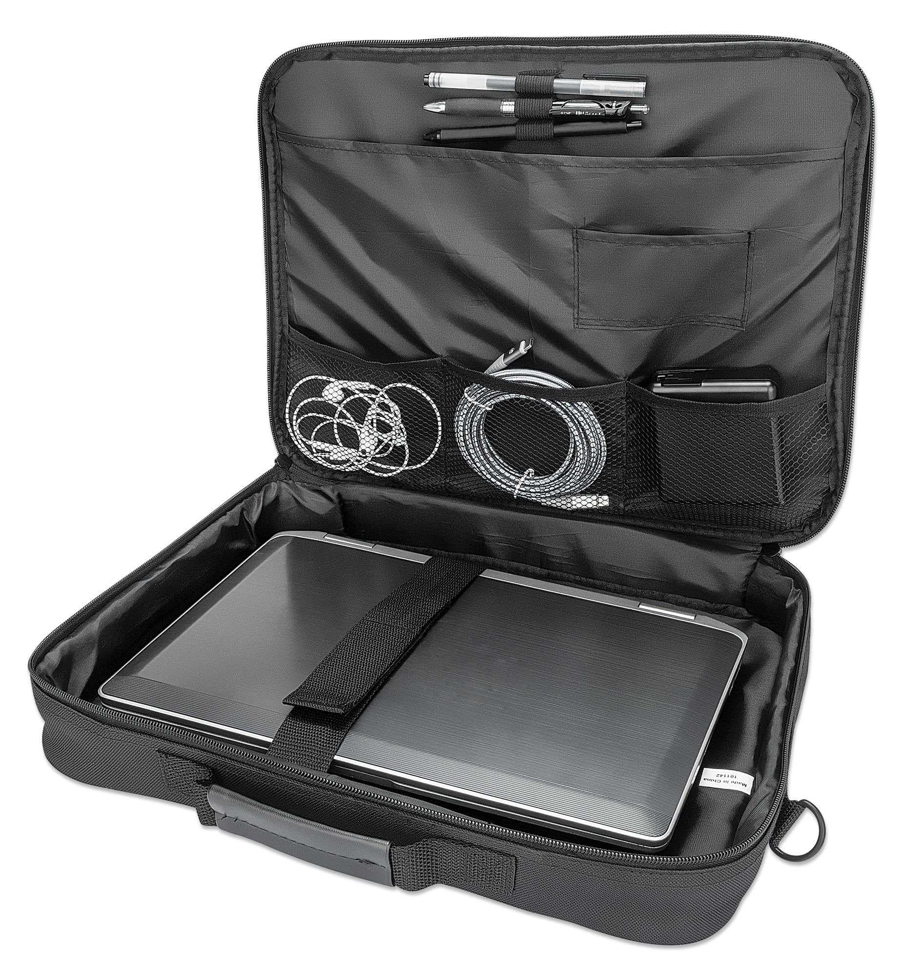 Apertura a conchiglia completa, si adatta alla maggior parte dei laptop fino a 15,6 pollici, ampio scomparto per notebook imbottito, tasche anteriori, posteriori e interne, tracolla, maniglia, nero