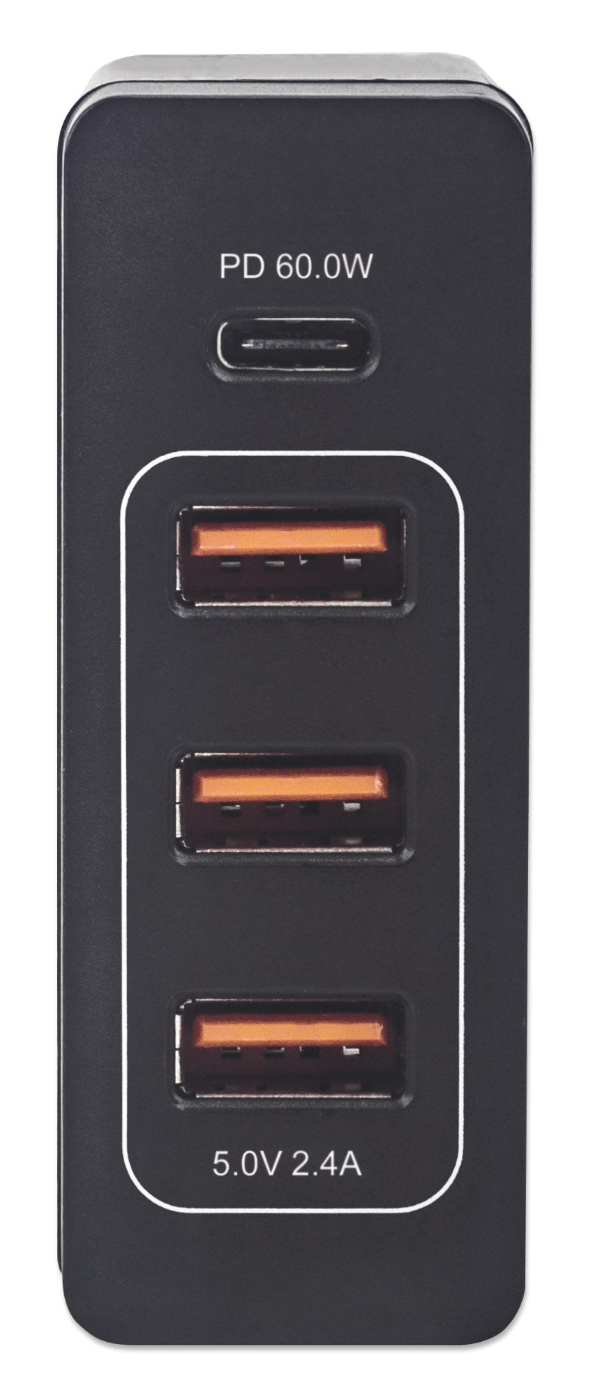 Una porta USB-C Power Delivery fino a 60 W, tre porte di ricarica USB-A condividono fino a 12 W / 2.4 A, Nero