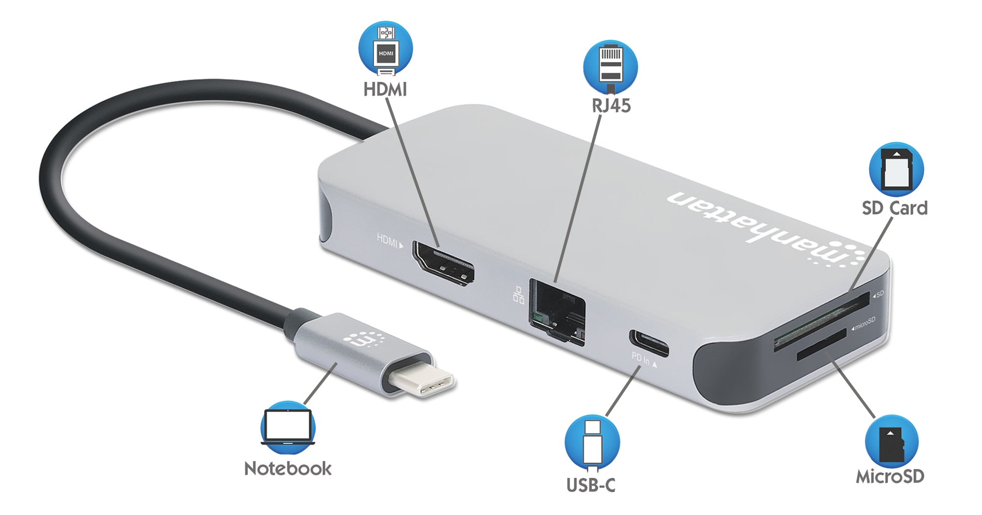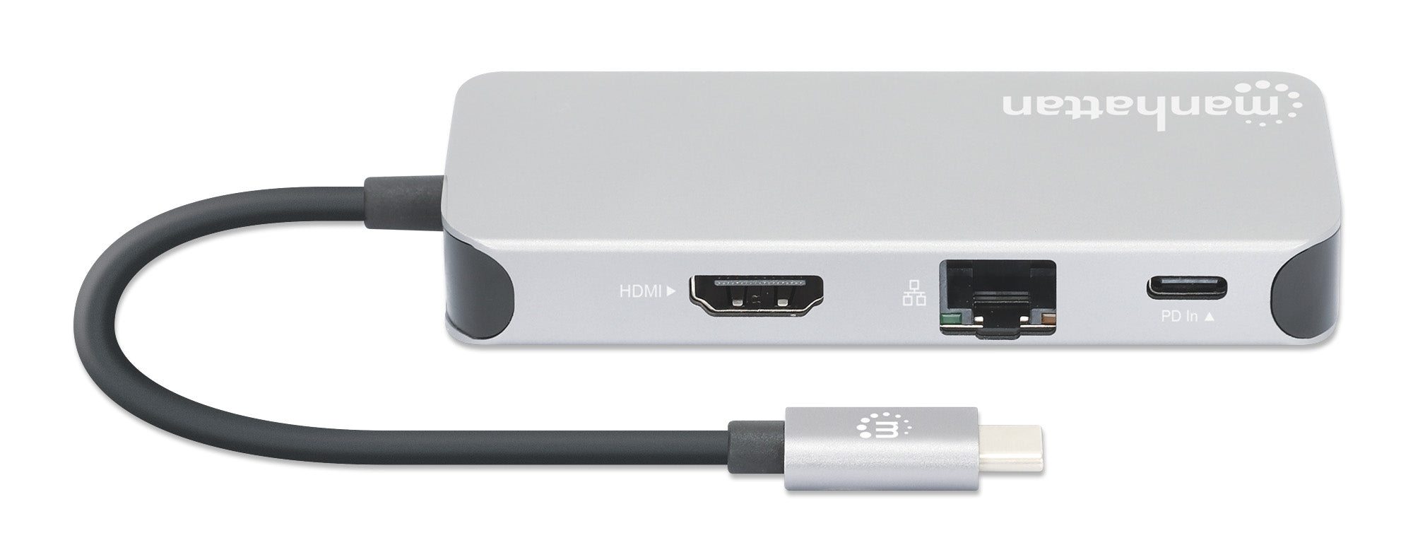 USB 3.2 Type-C Maschio a HDMI (4K@30Hz), tre USB-A (fino a 5 Gbps), Gigabit RJ45 e USB-C PD (100 W) Femmina, lettore SD/microSD, Alluminio Grigio