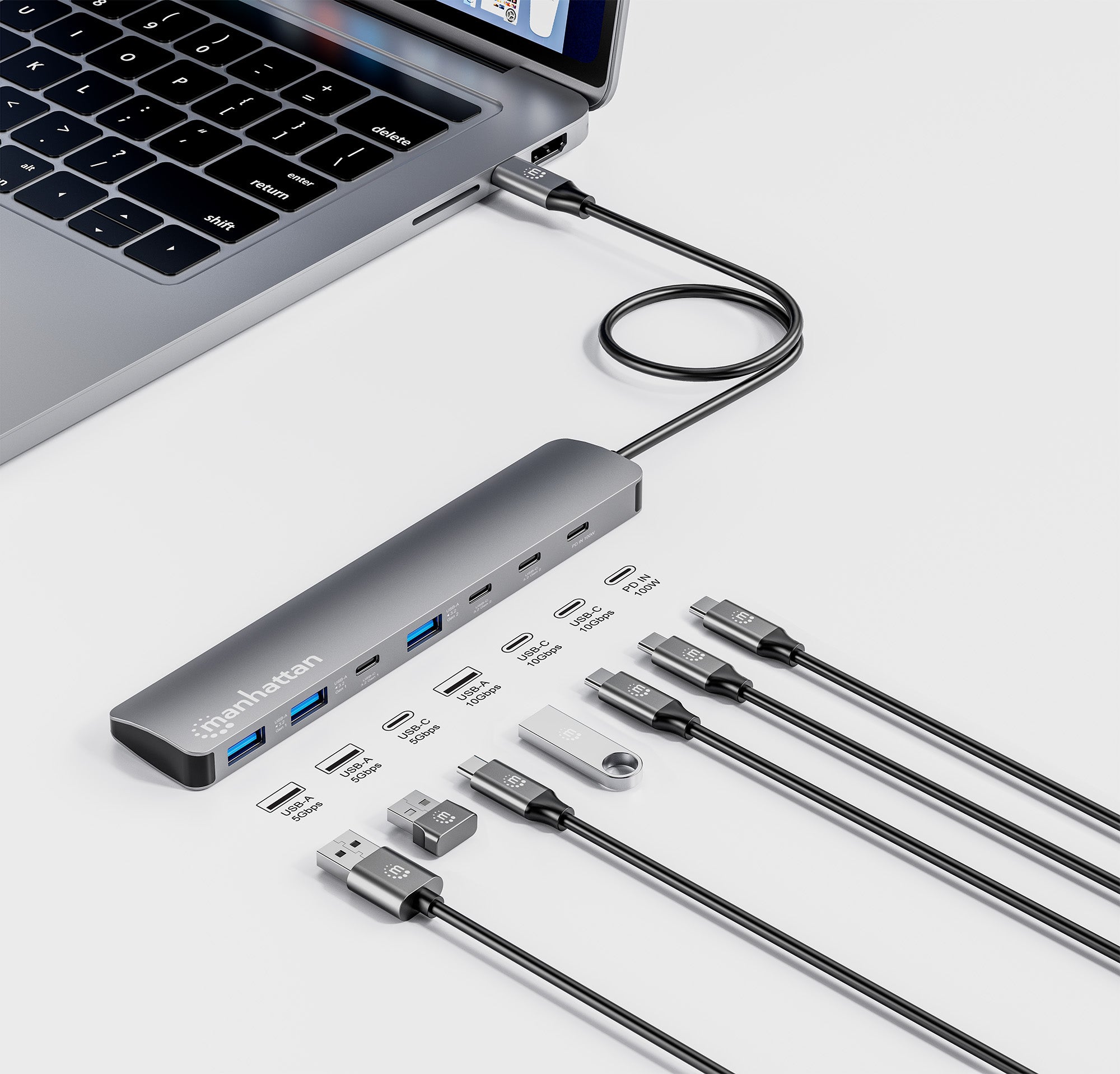 Usb-C Maschio a quattro porte USB-C e tre porte USB-A, fino a 10 Gbps SuperSpeed+ USB (USB 3.2 Gen 2), Bus Powered or 100 W USB-C PD Charging Port, Aluminum, Space Gray