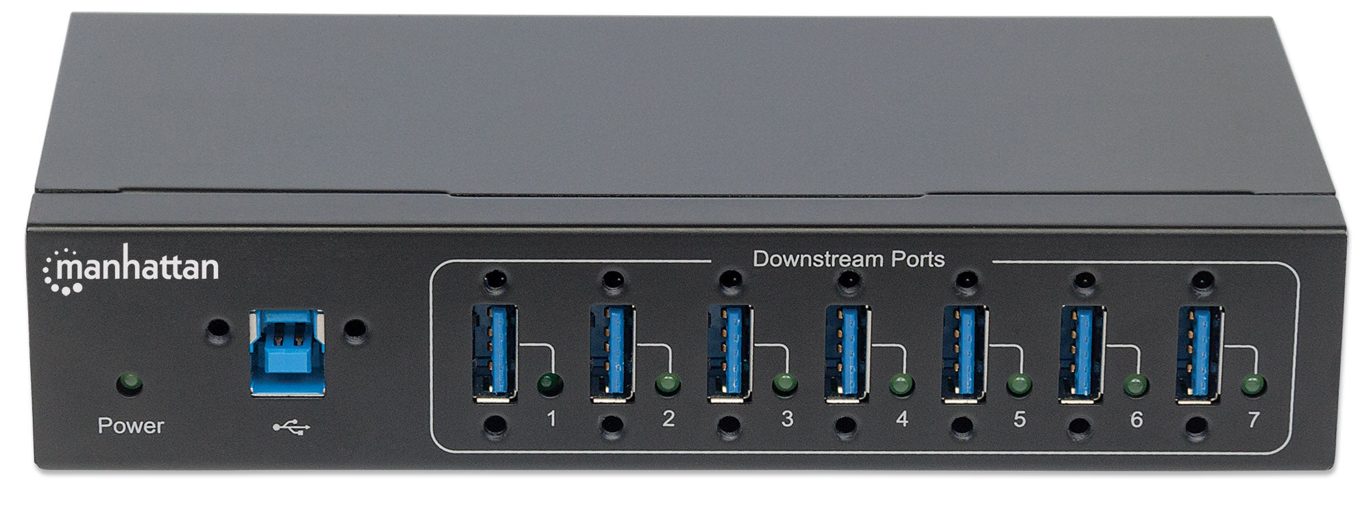 Sette Porte USB 3.2 Tipo A, Protezione ESD 20 kV, A/C, alimentazione opzionale tramite bus e morsetti, guida DIN, montaggio a parete, custodia metallica, vite di sicurezza