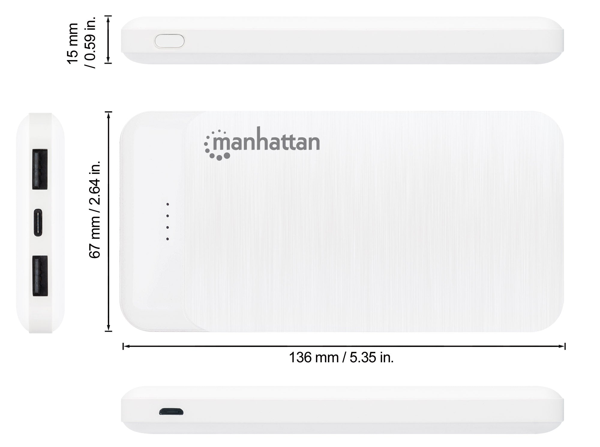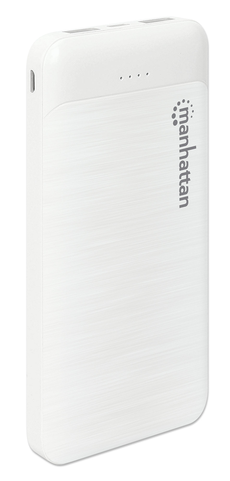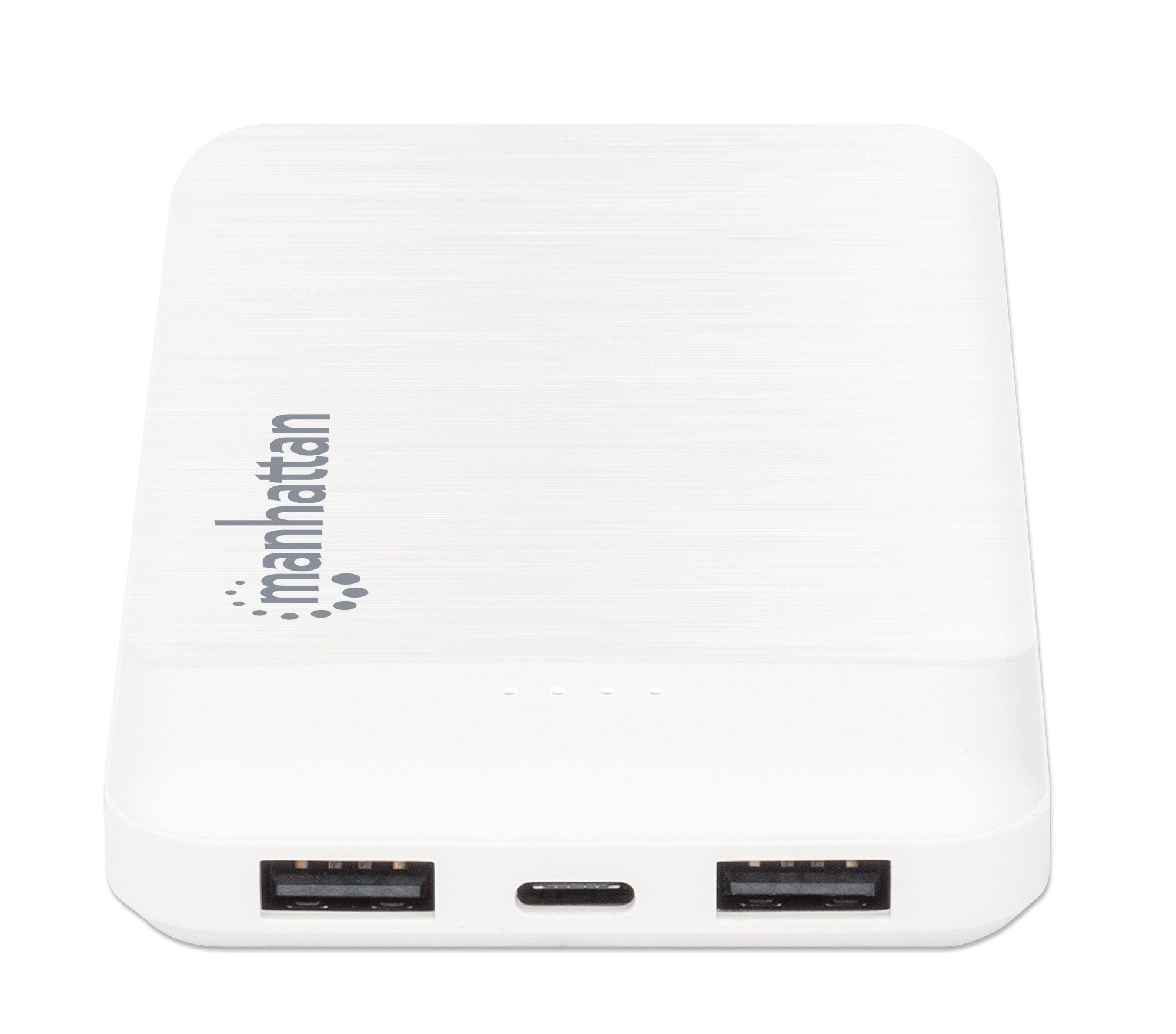 Due porte USB-A in uscita (2.1 A e 1 A), due porte in ingresso (USB-C e Micro-USB, 2 A ciasucna), 10.000 mAh, Bianco