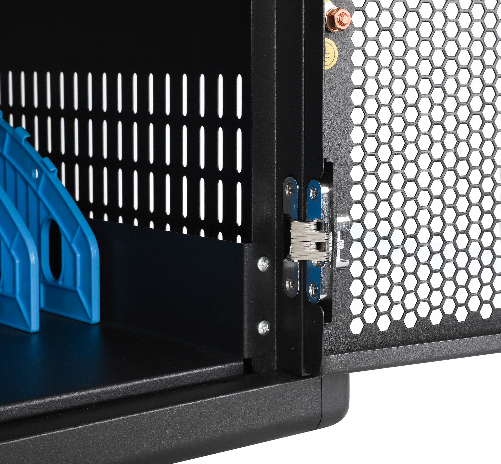 - Porta frontale in acciaio forato con maniglia a battente e serratura a tre punti; sistema di chiusura a chiave o con combinazione a quattro cifre
