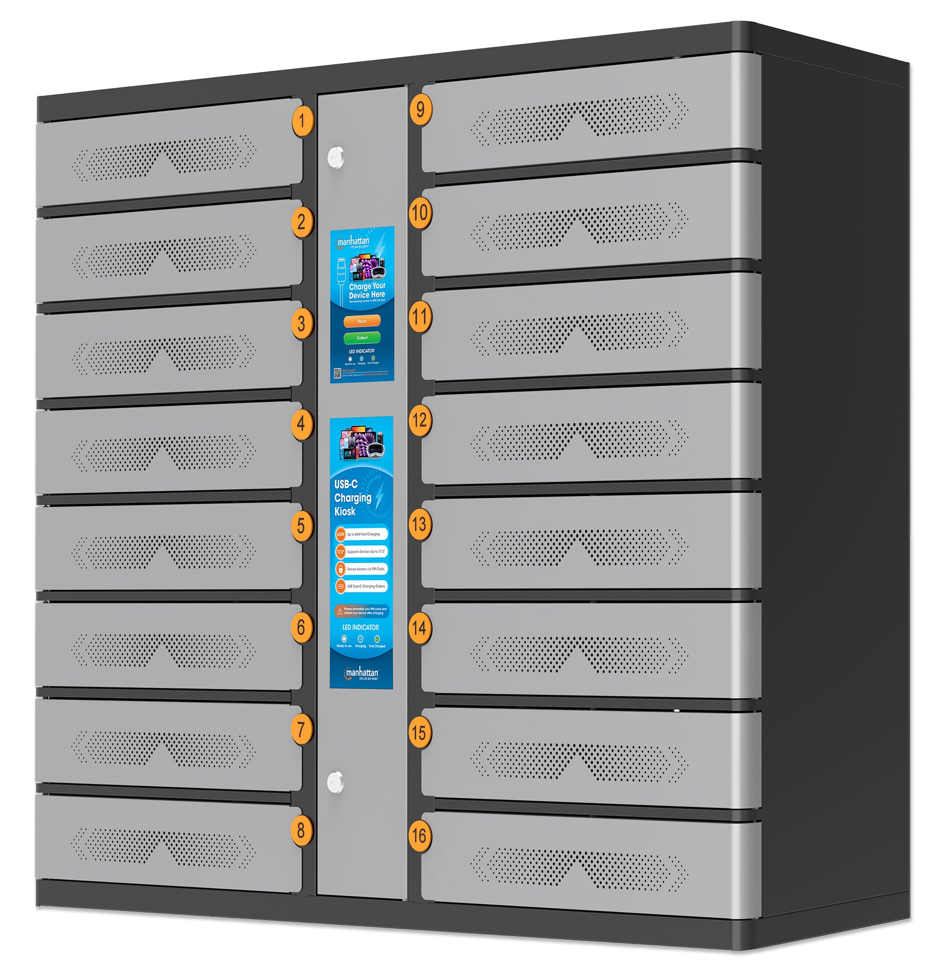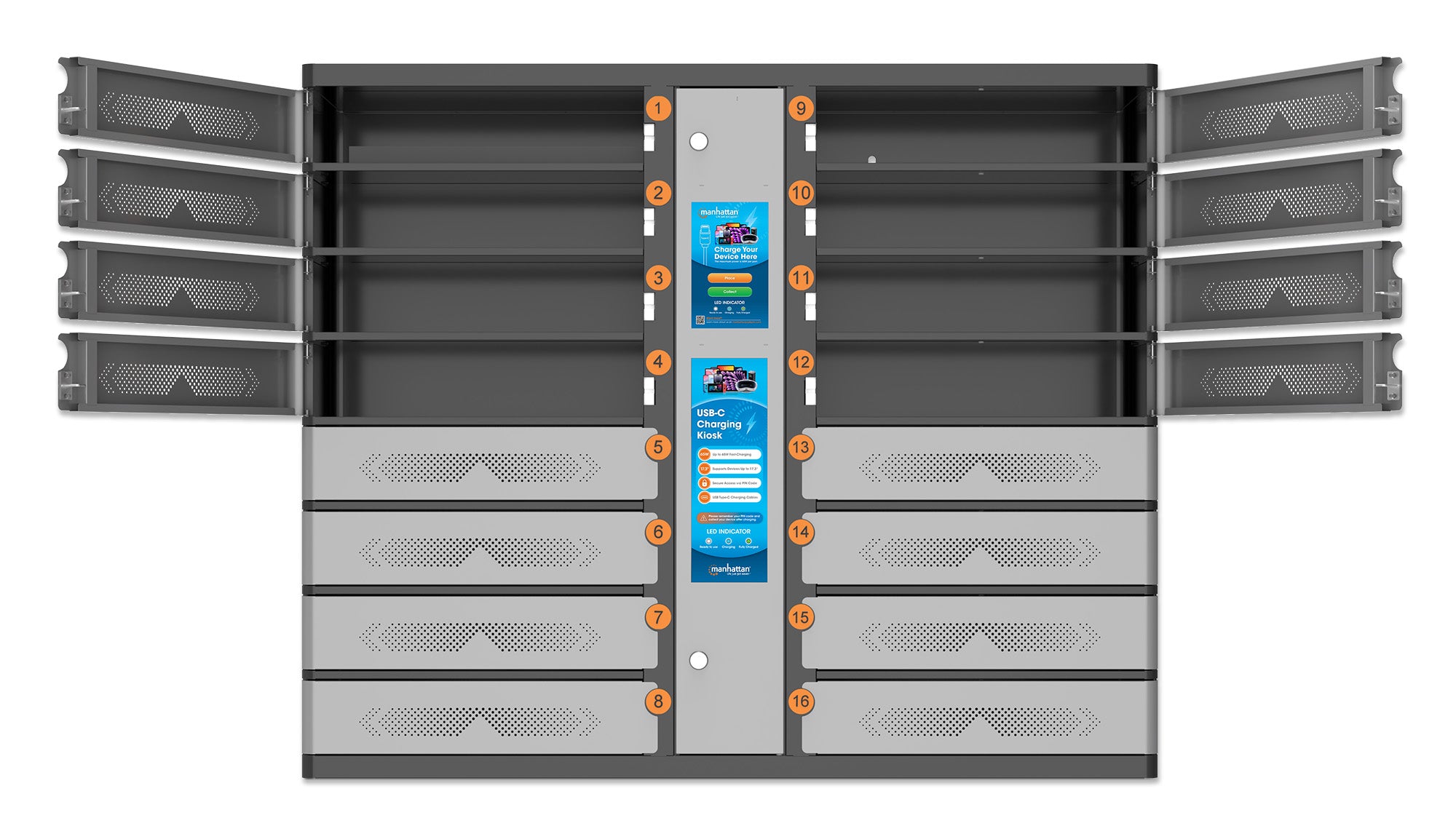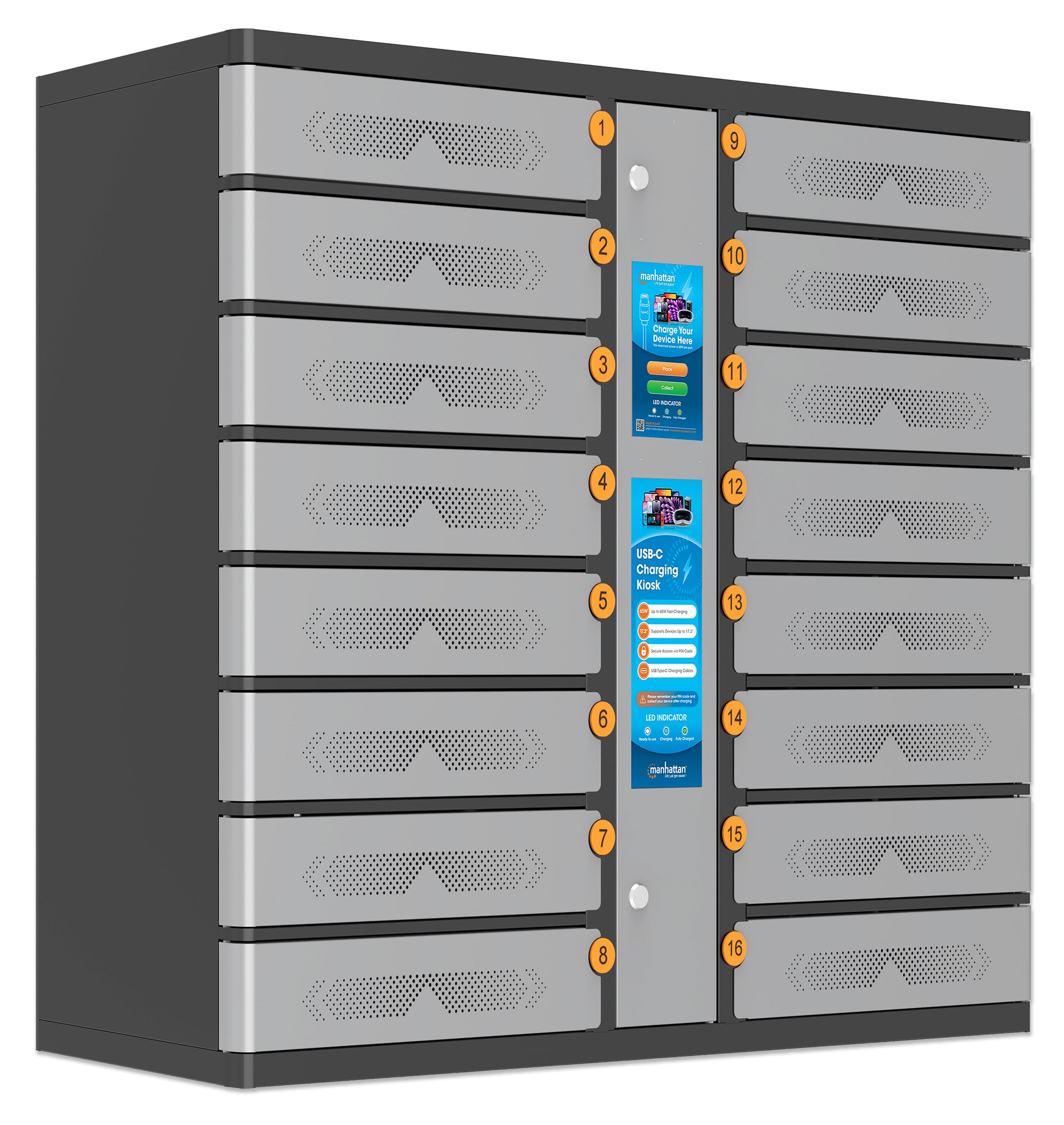 Armadio di ricarica rapida con 16 scomparti per laptop e altri dispositivi fino a 17.3" dotato di chiusura con codice di sicurezza, cavi USB-C PD fino a 65 W inclusi, accesso touchscreen per condivisione self-service, 850 W totali, protezione da sovratensioni, montaggio a parete, grigio