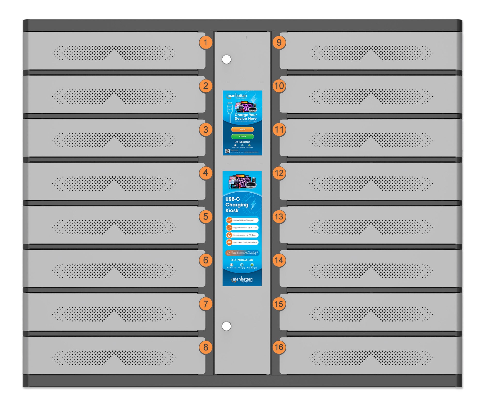 - Sedici cavi USB-C Power Delivery inclusi per la ricarica rapida con fino a 65 W per compartimento; non sono richiesti adattatori AC o caricabatterie da muro