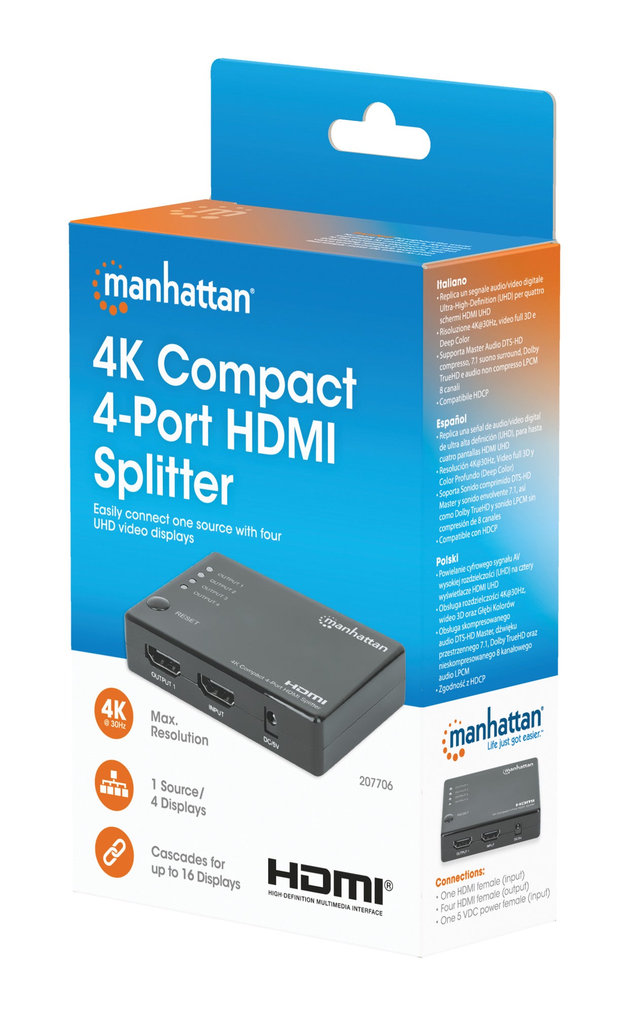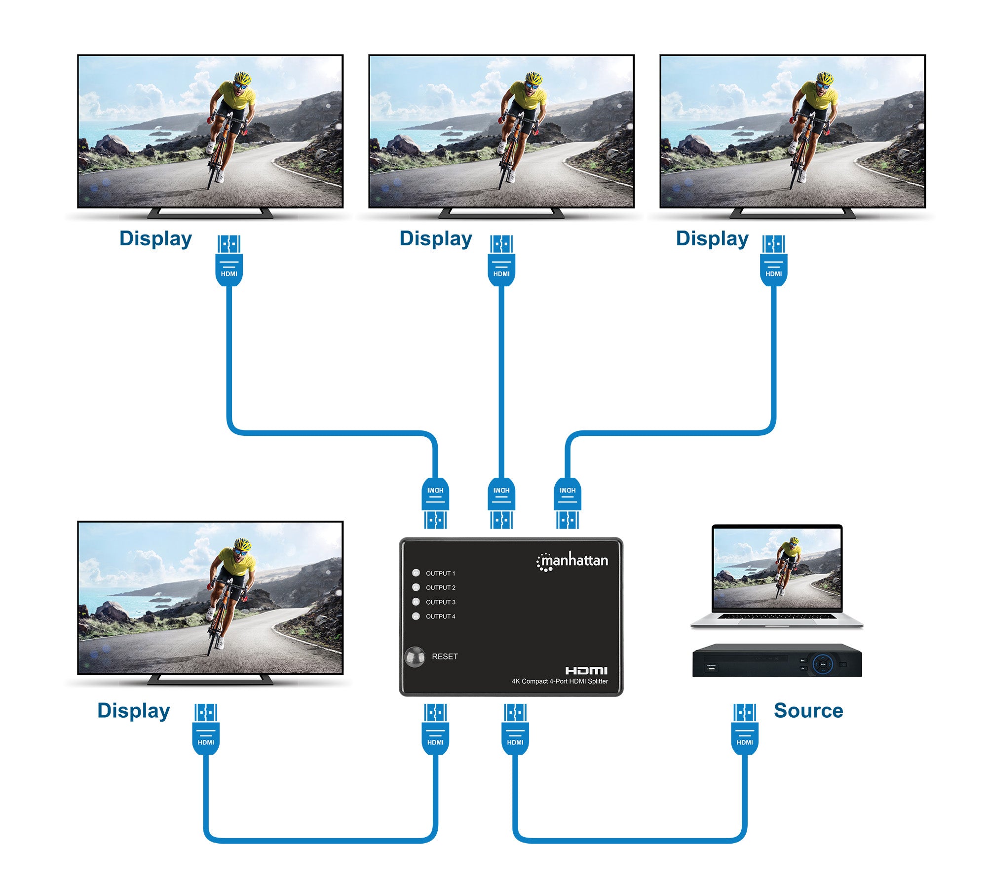 - Replica un segnale audio/video digitale Ultra-High-Definition (UHD) per quattro schermi HDMI UHD