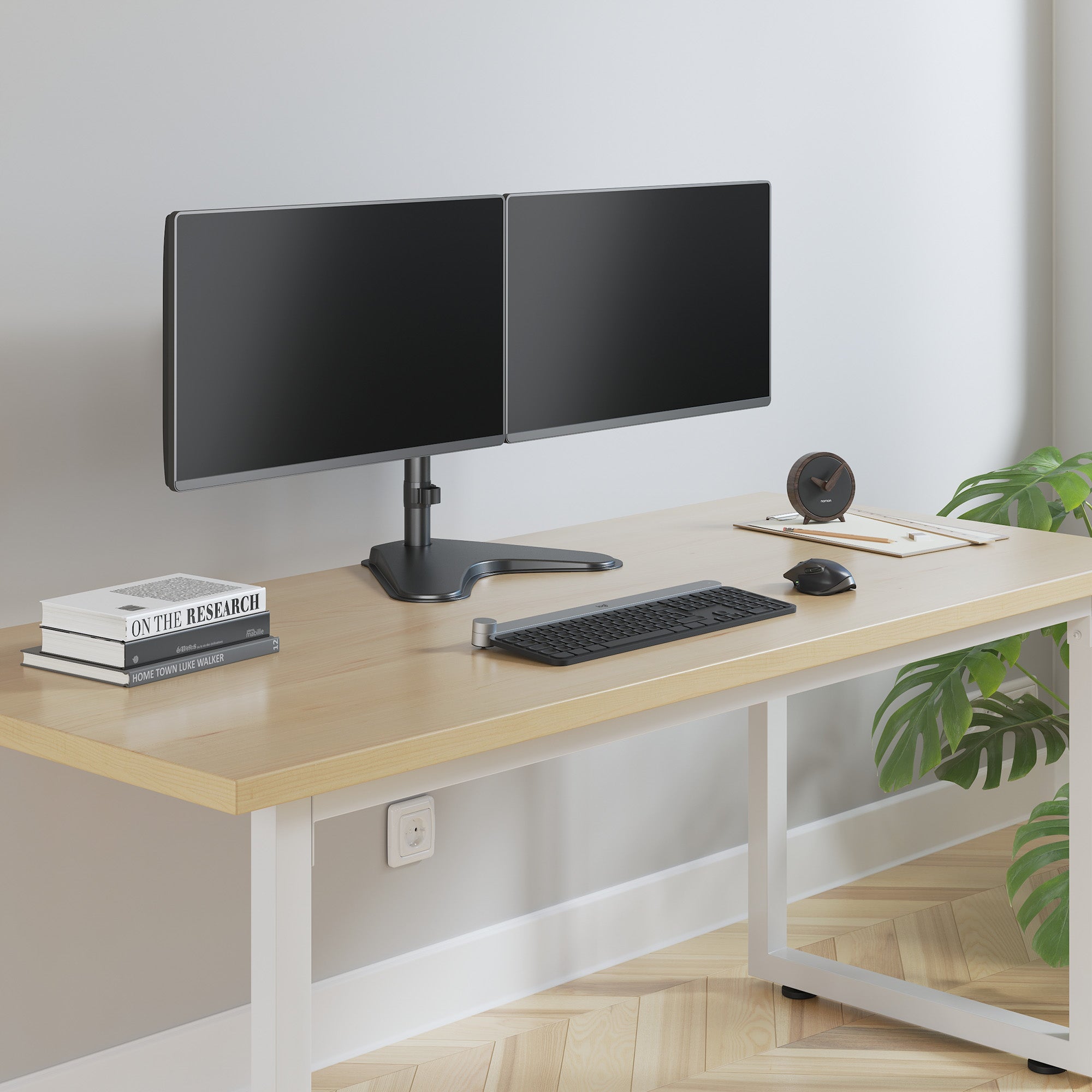Supporto universale per due monitor con base e doppio snodo di regolazione