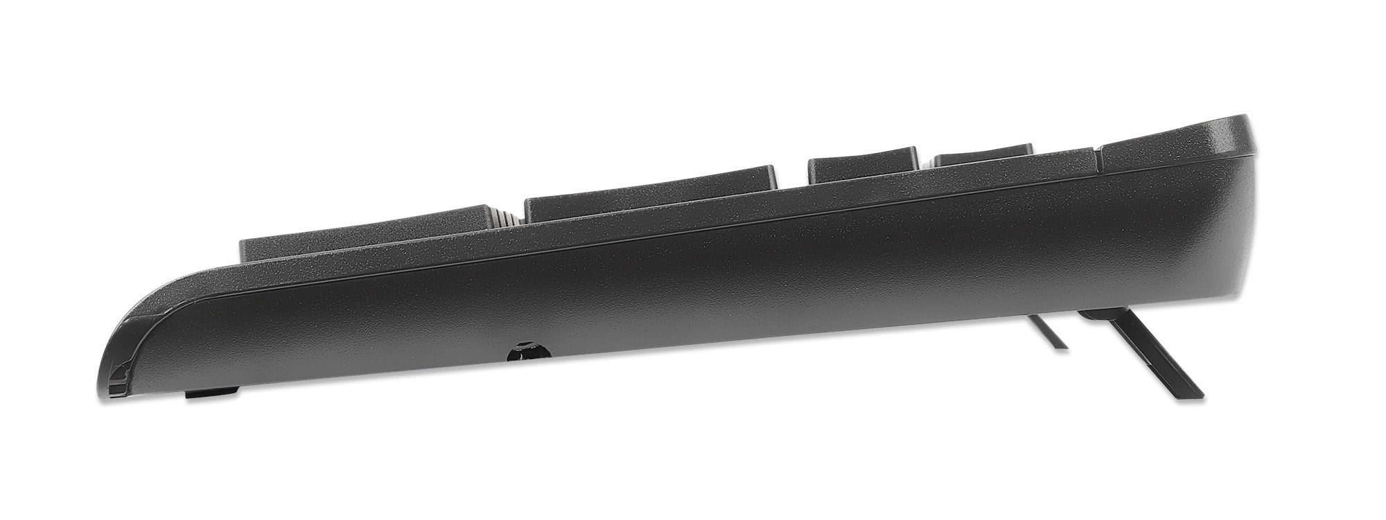 Un singolo nano ricevitore USB-A per entrambi, tastiera wireless di dimensioni standard con 12 tasti multimediali/funzione, mouse ottico ambidestro con tre pulsanti e rotella di scorrimento, 1200 dpi, nero