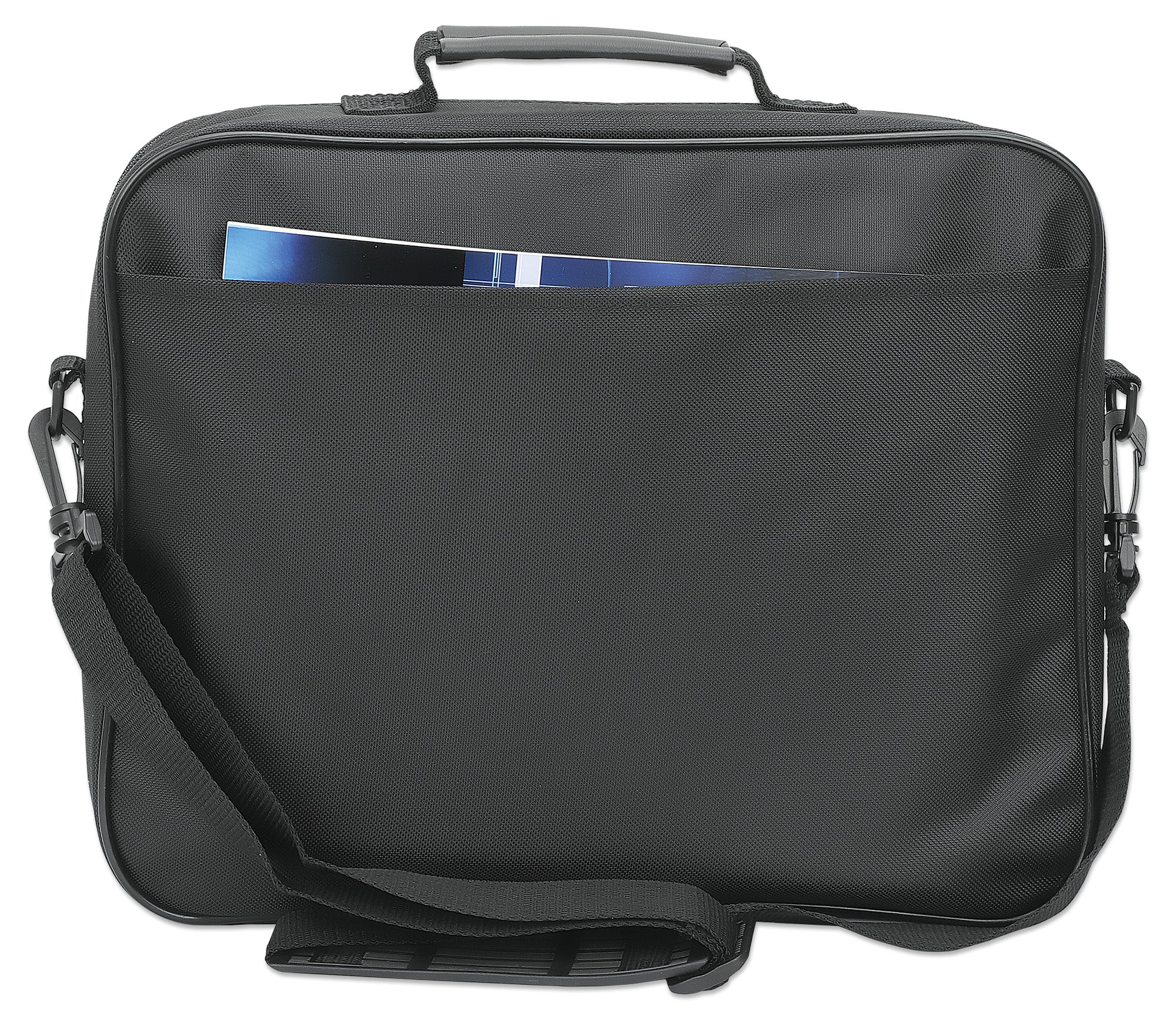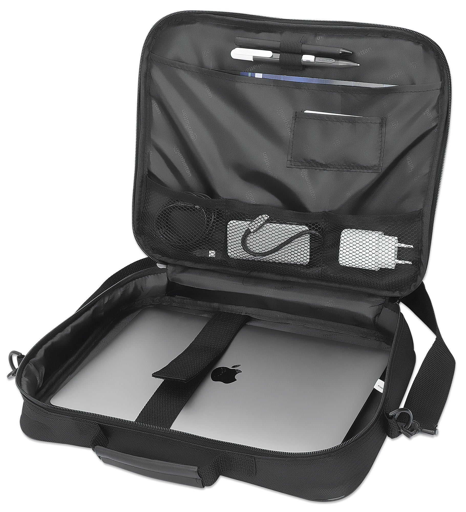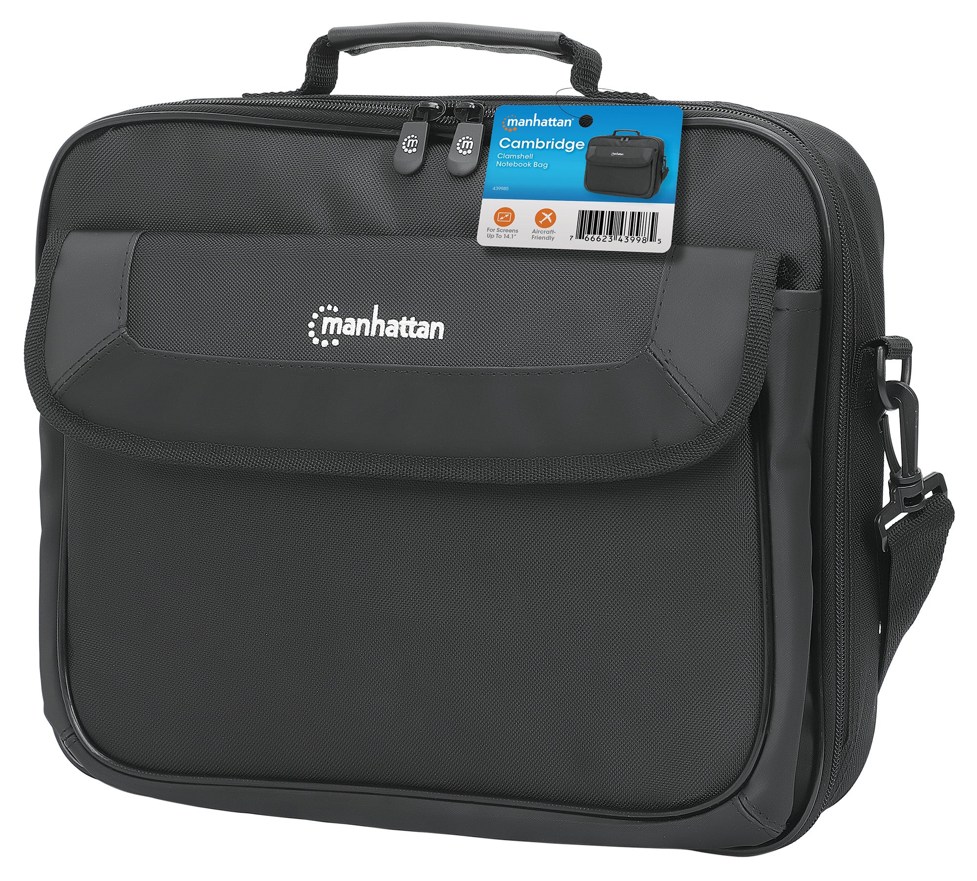 Apertura a conchiglia, indicata per la maggior parte dei laptop da 14.1", spazioso comparto imbottito per notebook, tasche frontali, posteriori e interne, tracolla, maniglia, nera
