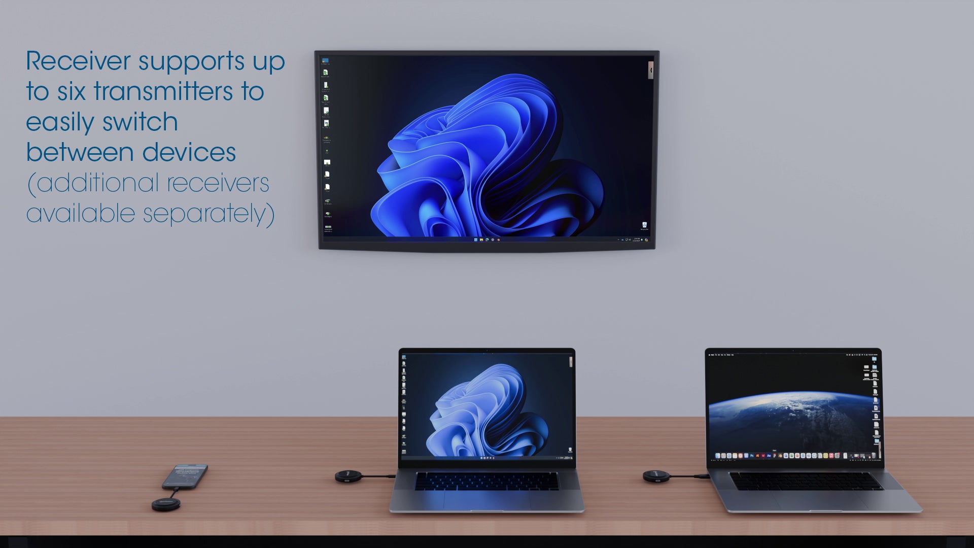 - Un ricevitore supporta fino a sei trasmettitori, consentendo a più utenti di collegare i propri laptop al display e di passare facilmente da un dispositivo all'altro durante le presentazioni collaborative