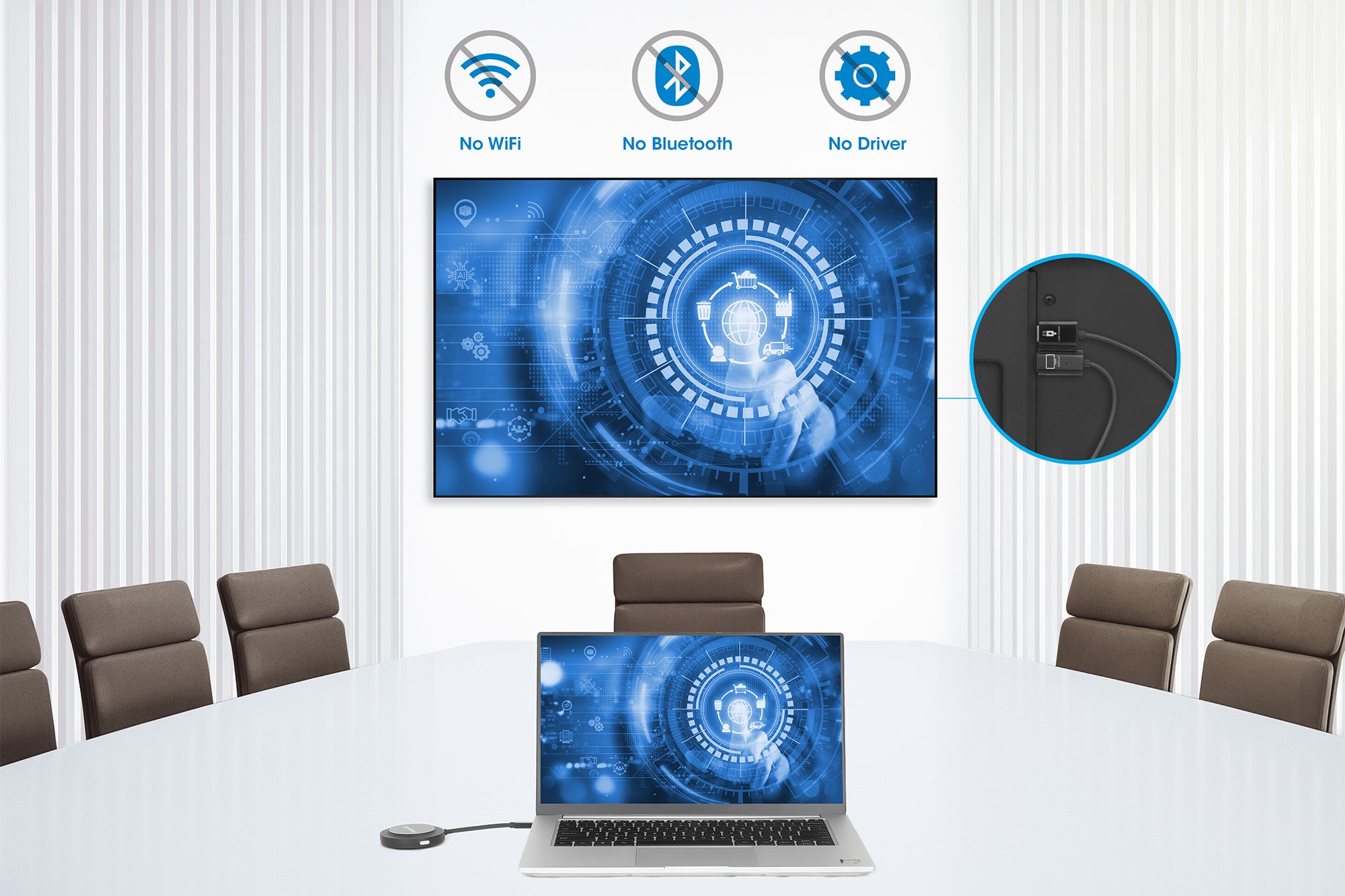 - Il ricevitore è un elegante cavo HDMI-USB-A da 0,6 m (2 piedi) che si collega facilmente alle porte del display per una rapida configurazione, con la connessione USB-A che funge da ingresso di alimentazione