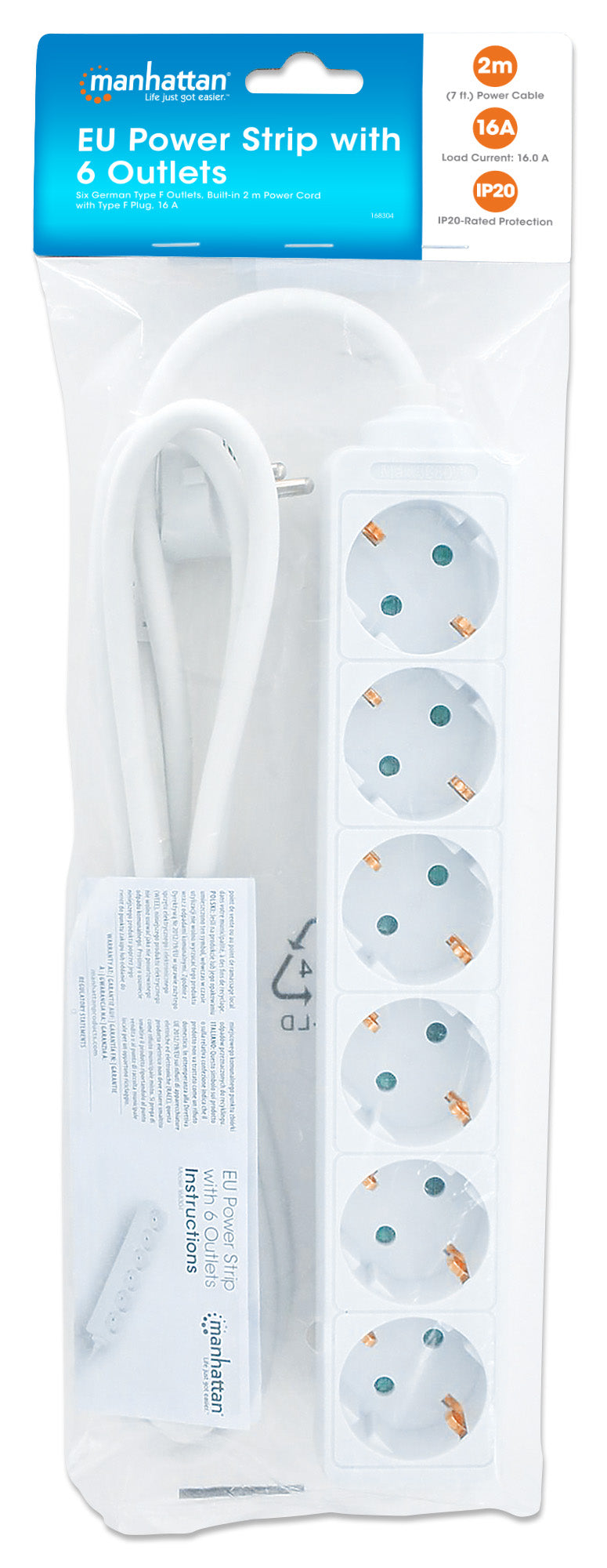 Sei prese tedesche tipo F, cavo incorporato da 2 metri con spina tipo F, 16 A, colore bianco