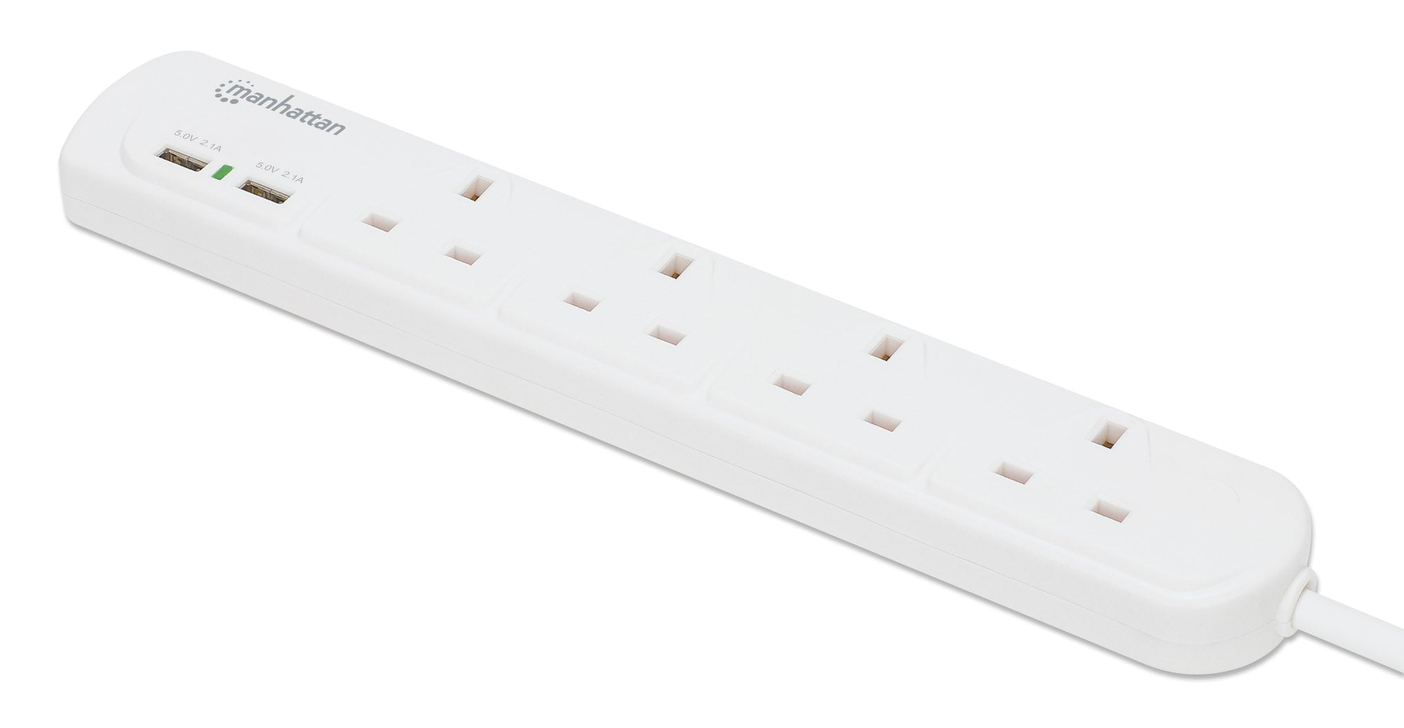 Quattro prese BS1363A britanniche, due porte USB-A con uscita condivisa da 2,1 A, cavo di alimentazione integrato da 2 m (7 piedi) con spina BS1363A, protezione interruttore automatico da 13 A, bianco