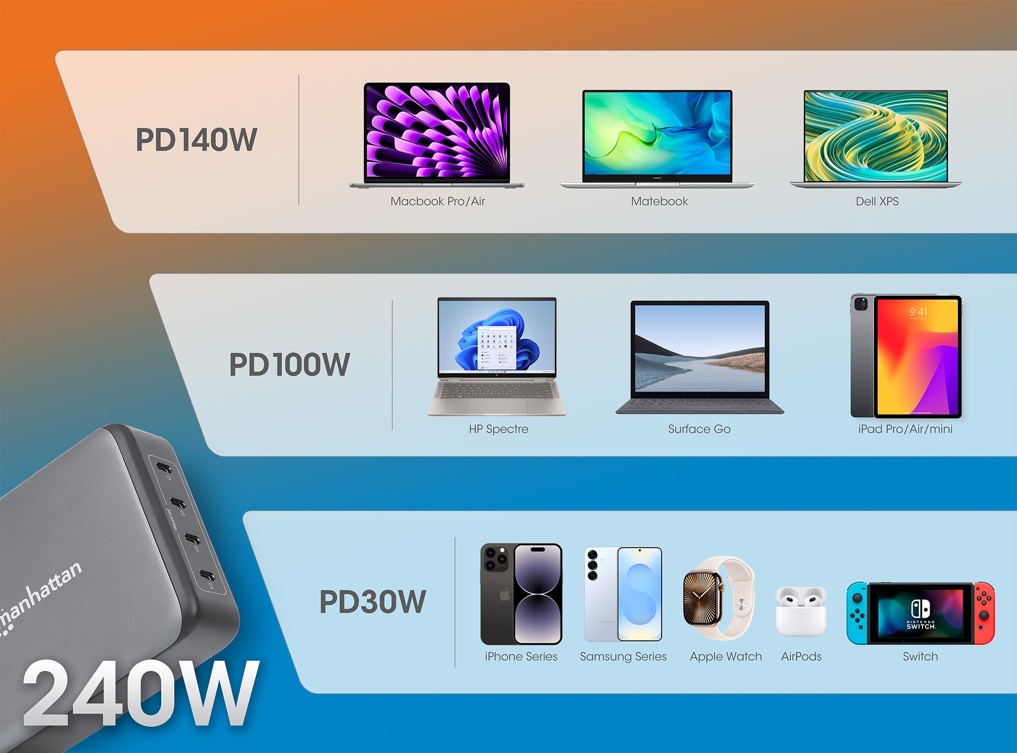 • Caricatore rapido ultra potente 4-in-1 per ricaricare fino a quattro dispositivi contemporaneamente con una potenza massima di 240 W