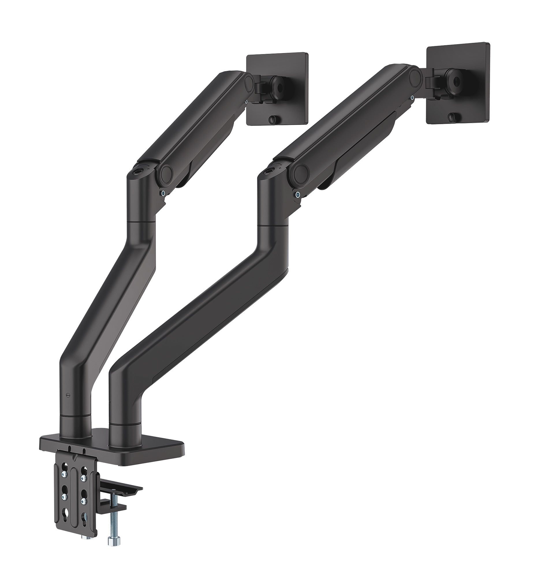 I bracci articolati sostengono due monitor da 17" a 45" fino a 20 kg ciascuno, altezza full-motion, regolazioni di inclinazione e rotazione, installazione con morsetto a C o vite passante, nero